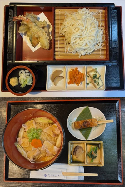 ▲上)「稲庭生うどん 天ぷら付き」 下)稲庭カレーうどん きりたんぽ付き