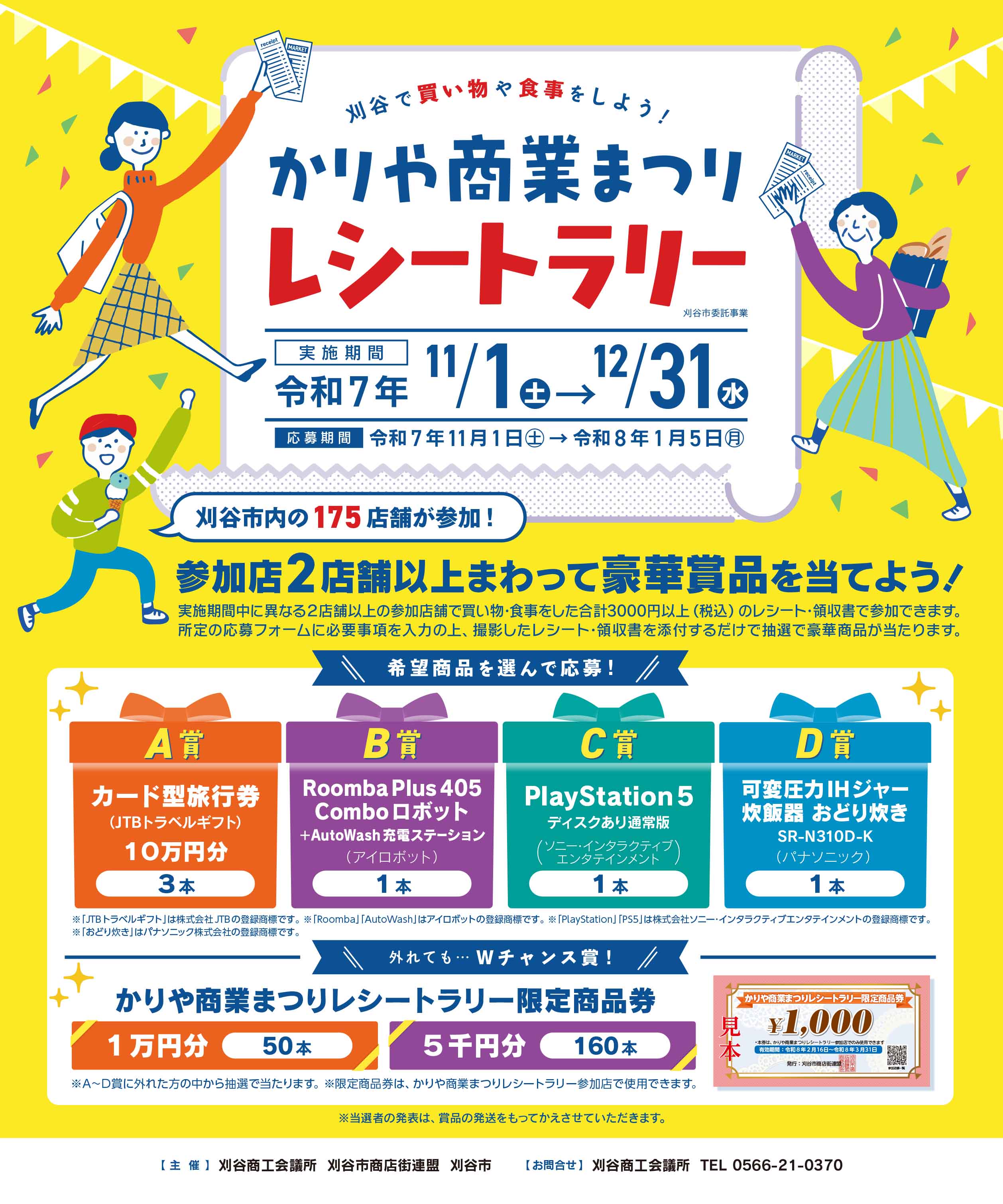 「かりや商業まつりレシートラリー」実施期間【令和7年11月1日(土)~12月31日(水)】のレシート・領収書(2店舗以上、合計3,000円(税込)以上)の写真を添付してください。