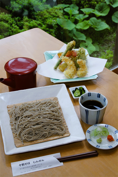 そばは打ち立て、茹でたて、更科粉100%の十割そば。キリリと仕上がったそばつゆが蕎麦のうまさをより一層挽き立てる。サックリ揚がった天婦羅も大評判。写真の「天ぷらそばセット」は、海老天2本、カボチャ、パプリカ、マイタケ、大葉、ほか、季節の素材付き。丼類とのセット、「ゆばそば」「サラダそば」などの創作そばも人気。