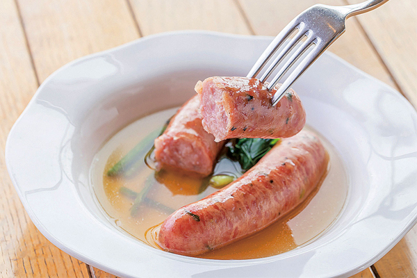 ▲ビールにピッタリ!スープでボイルした「行者にんにくソーセージ1,540円」。土産用パックも販売中